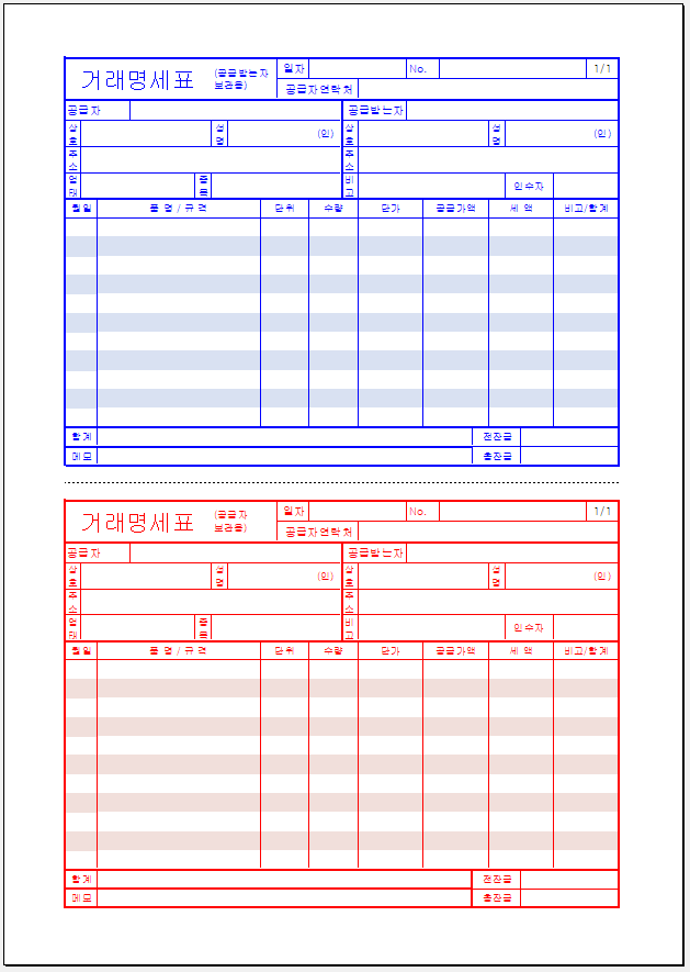 여러 종류의 거래 명세서 양식을 준비해 두면 상황에 따라 선택해 사용할 수 있어 업무 효율을 높일 수 있습니다. 거래 명세서 양식을 다운로드해 필요할 때 활용하시기 바랍니다.