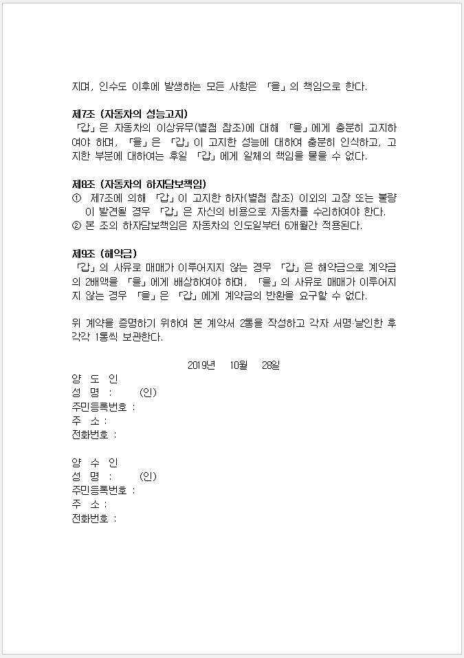 중고차 매매 계약서를 작성하기 위해서는 아래 링크를 통해 한글(HWP) 파일 양식을 다운로드하실 수 있습니다. 파일을 다운로드한 후, 필요 사항을 채워넣고 계약을 체결하면 됩니다. 압축파일 형태로 제공하며 압축파일 비번은 1357913579로 설정해 두었으니 참고하시고 이용하시면 됩니다.