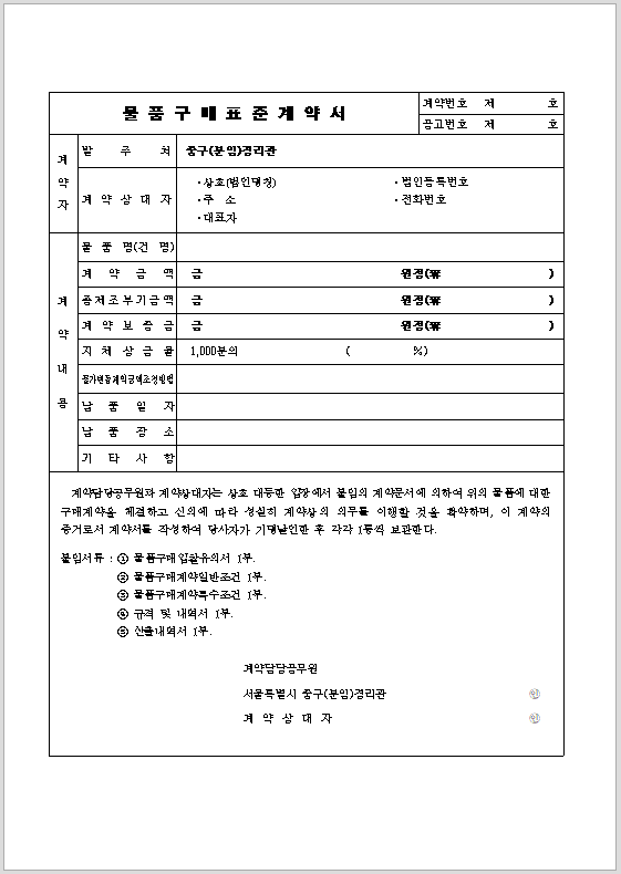 물품구매 계약서 양식은 양측 간의 권리와 의무를 명확히 규정하는 중요한 문서입니다. 계약서를 작성할 때 세부사항을 구체적으로 기재하여 향후 발생할 수 있는 분쟁을 예방해야 합니다. 무료 서식은 법제처나 서식 제공 사이트에서 다운로드 가능하며, 필요한 항목을 포함하여 작성하는 것이 중요합니다.