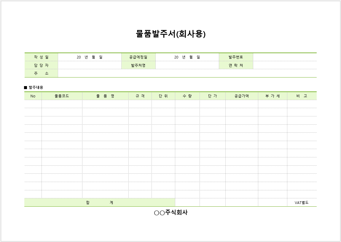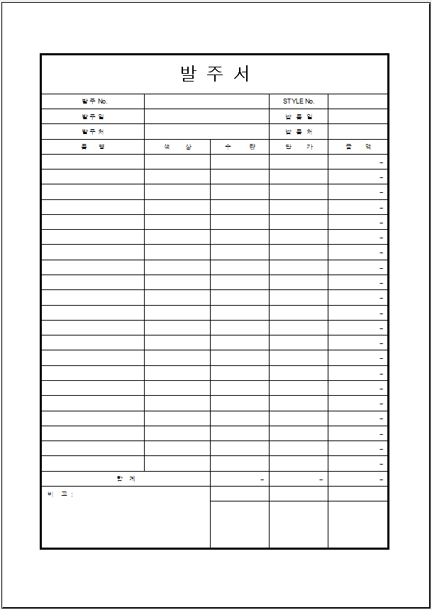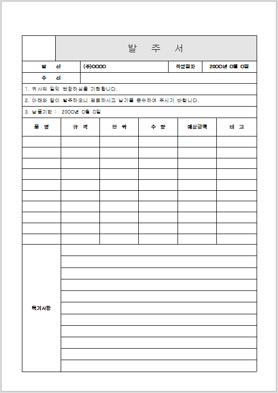 발주서 양식은 회사나 업종, 물품 특성에 따라 구성이 달라지기 때문에 절대적인 표준 양식은 없다. 그래서 무료로 제공되는 발주서 양식을 다운로드한 후, 회사 로고와 정보를 추가해 자체 양식으로 사용하는 경우가 많다.