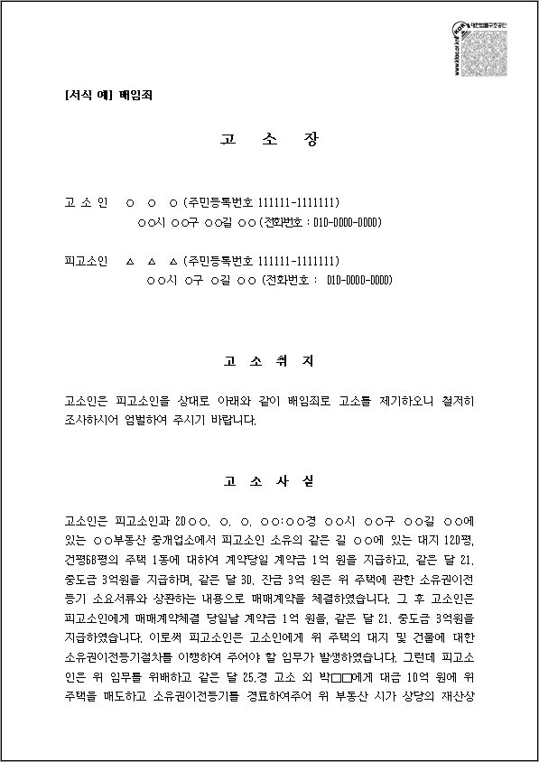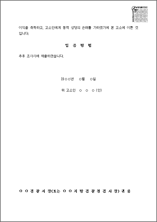 ▶ 업무상 횡령 고소장 양식 한글 hwp 파일
