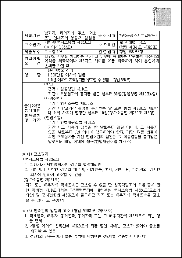 이렇게 위에 나온 캡쳐 사진과 같은 파일을 다운로드할 수 있습니다. 고소권자, 친족 간 범행과 고소 등 여러 가지 내용과 기본적인 배임죄 성립, 제출기관 등의 정보가 함께 수록되어있습니다 아래를 참고해서 이용하시기 바랍니다.