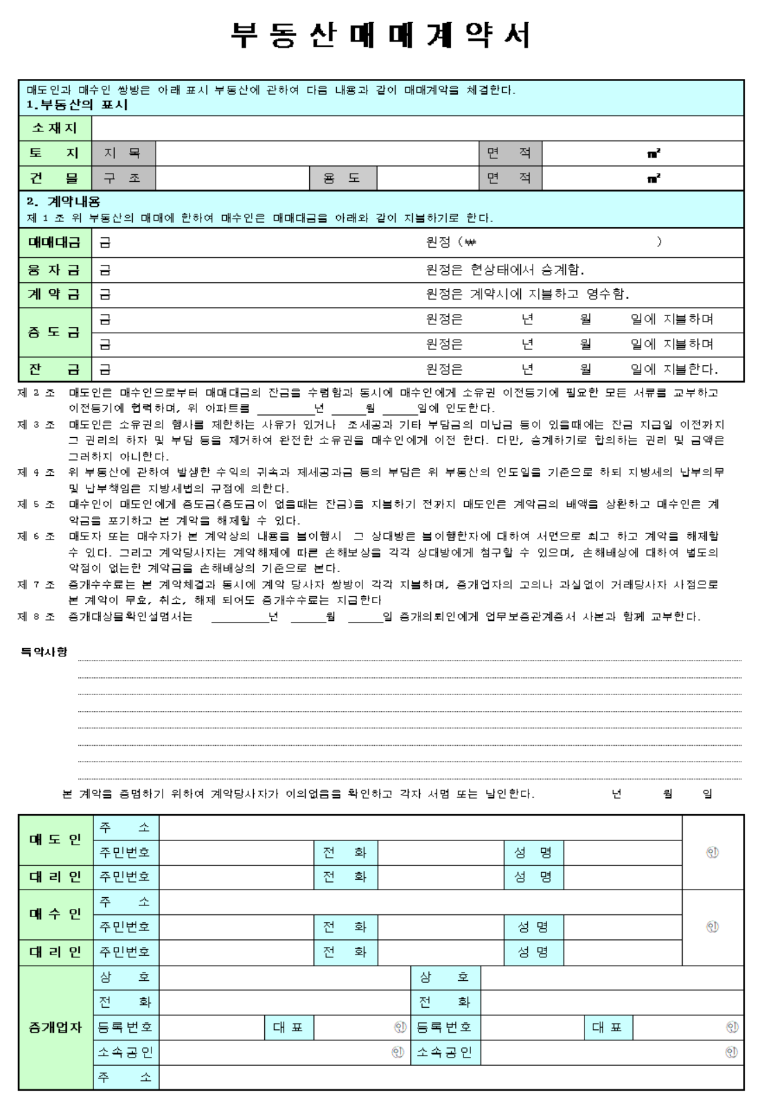 부동산 매매계약서는 거래의 법적 효력을 보장하는 중요한 문서입니다. 무료 양식을 다운로드하여 계약 내용을 정확히 작성하고, 신중한 검토를 거쳐 안전한 부동산 거래를 진행하세요.