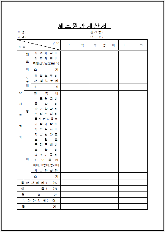원가 계산서 필수 항목
