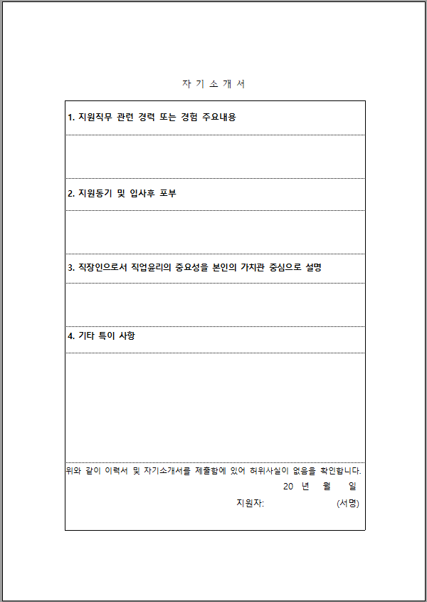 자기소개서 양식 무료 서식 공유, 무료 자기소개서 양식 다운로드, 합격 자기소개서 샘플, 자소서 기본 양식 서식, 심플한 자기소개서 무료 서식 등을 찾는 분들을 위해 취업과 이직의 핵심 서류인 자기소개서 표준 양식을 정리했습니다. 이력서가 본인의 궤적을 보여준다면 자기소개서는 본인의 잠재력과 직무 적합성을 어필하는 도구인 만큼, 자기소개서 양식 무료 서식 공유 자료를 활용하여 인사 담당자의 마음을 움직이는 나만의 스토리를 완성하시기 바랍니다.