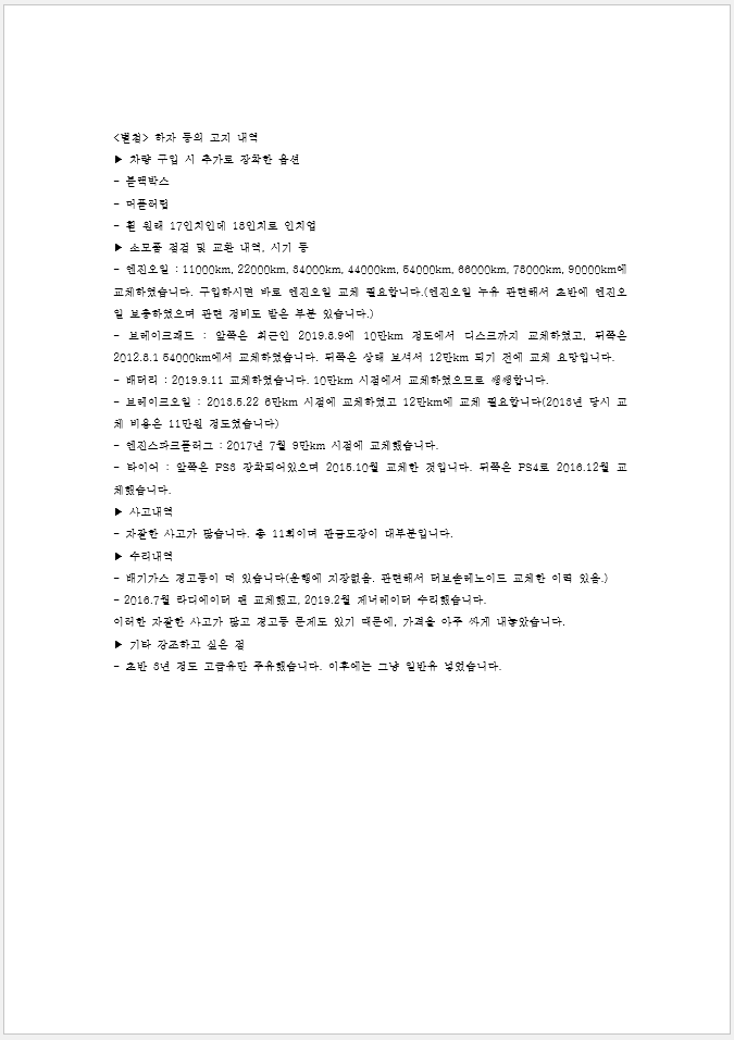 - 보증 기간 및 정비 기록: 차량의 보증, 정비 이력 등 추가적인 사항이 있다면 기재합니다.