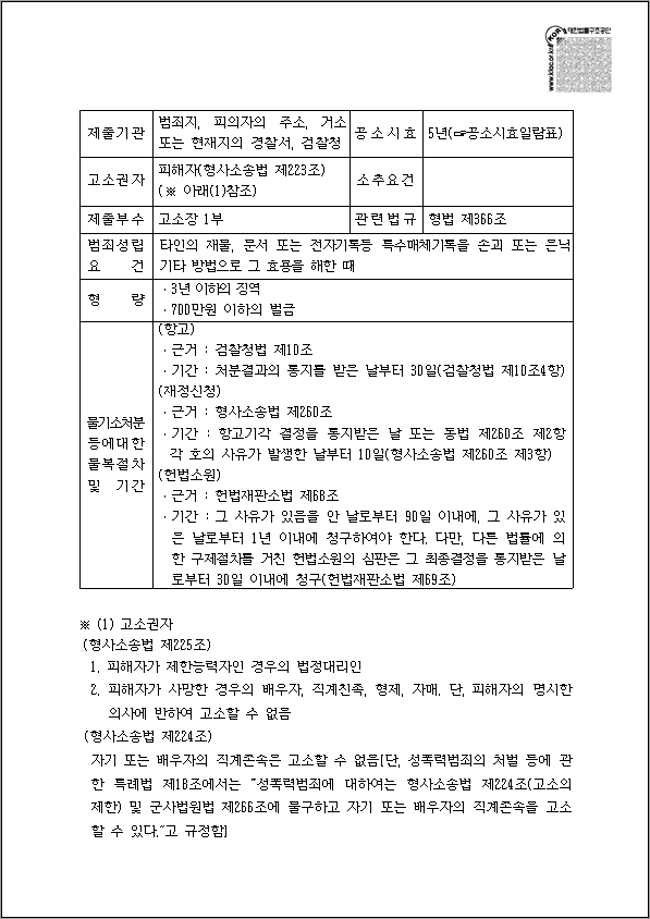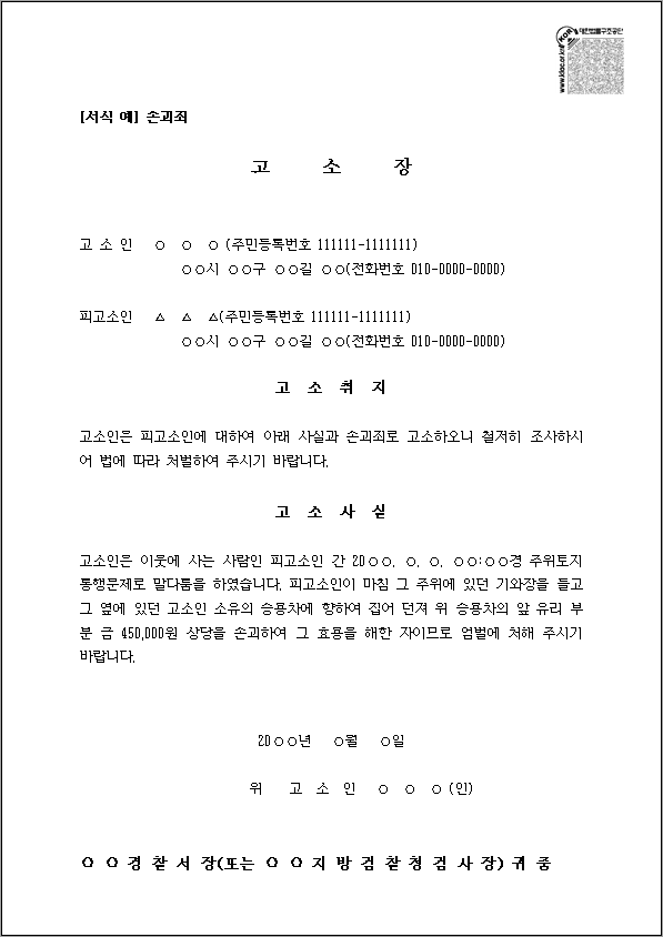 재물 손괴죄에 대한 고소장 양식 무료