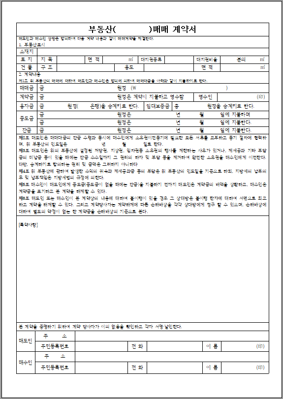 - 특약 사항: 추가적인 합의 내용(예: 위약금, 계약 해제 조건 등)
