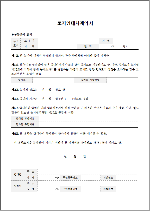 토지 임대차 계약서는 토지를 임대하거나 임차할 때 필수적인 문서로, 계약 당사자 간의 권리와 의무를 명확히 규정합니다. 특히 밭, 논, 임야와 같은 농업용 토지의 임대차 계약은 그 특성상 정확한 조건을 명시하는 것이 중요합니다. 이 글에서는 토지 임대차 계약서 양식 다운로드 방법과 작성법을 안내드립니다.