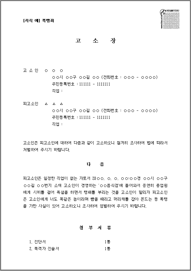 ※ 폭행죄 고소장 양식 작성 후 기본정보