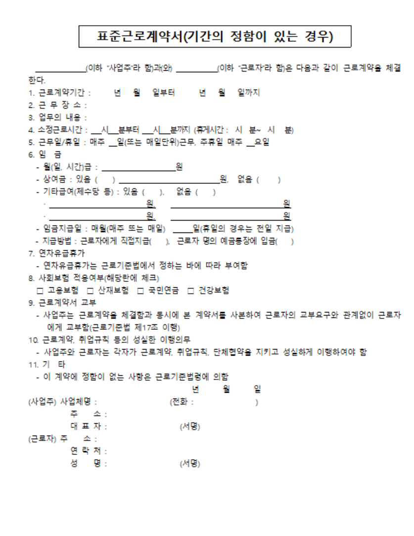 아래 공유되는 표준 근로계약서 양식은 고용노동부에서 제공하는 양식 입니다. 압축파일 형태로 올려 놓습니다. 압축파일 형태로 제공하며 압축파일 비번은 1357913579로 설정해 두었으니 참고하시고 이용하시면 됩니다.